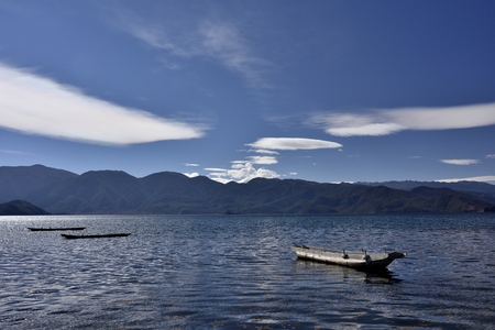 The reflection of blue sky and white clouds on the water surface of Lugu Lake in China