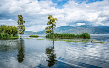 Erhai lake scenic view with trees in middle of water in Dali Yunnan China