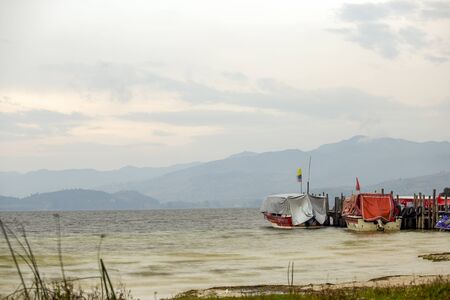 Multiple exposure of a view of lake Tota, the largest natural lake of Colombia, located in the central Andean mountains of the country, with a wooden dock and boats moored to it in a cloudy day.