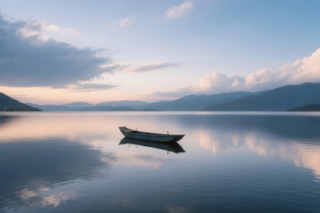 Boat on the lake in the morning, Liguria, Italy