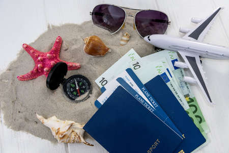 Travel preparation. A lot of objects are scattered on gray background - a camera, tickets, documents, a toy plane. Family holidays, holidays near the sea, holidays.