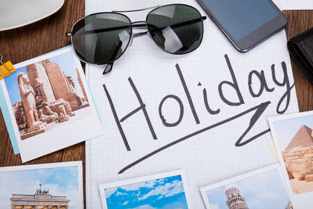 Photos Of Holiday On Wooden Desk With Sunglasses And Smartphone