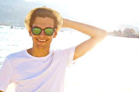 Relaxed young man at home on the balcony. Holiday and travel concept