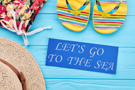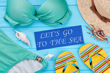 Inscription, bright beach clothing. Summer fashion for vacation.