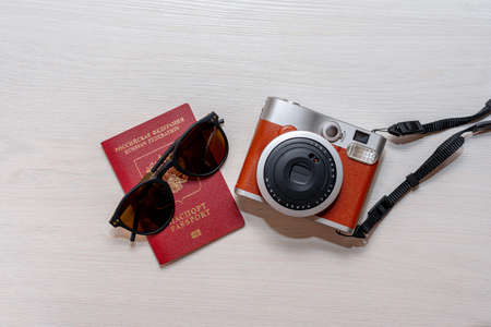 Sunglasses with the passport of a citizen of the Russian Federation and an instant photo camera on a white wooden background