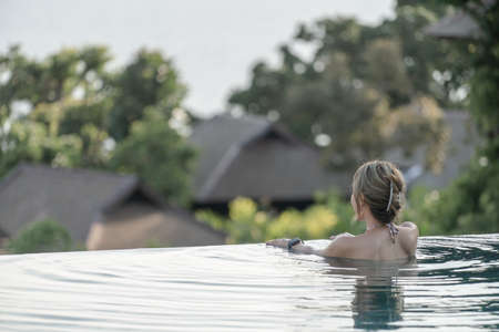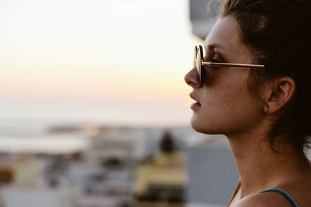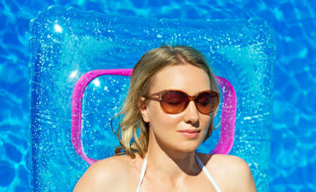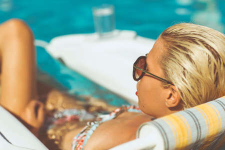 Attractive woman relaxing on holiday sunny sky outdoors background. Luxury vacation summertime