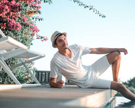 Ethnic Stylish young man white dressed lying near a swimming pool looking on the right