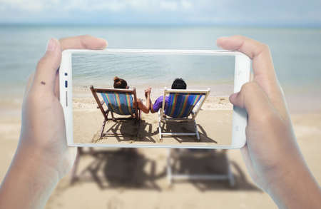 Couple traveler sitting on chair taking photo with smartphone on the beach