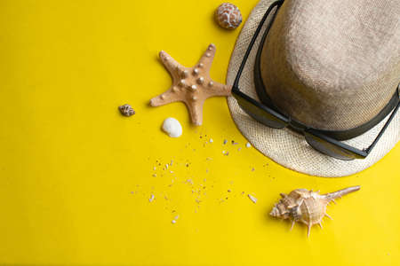 Summer accessories, shells, hat and sun glasses on yellow background. Summer vacation and sea concept.