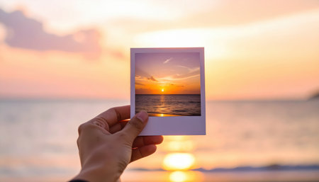 A hand holding a polaroid photo of a sunset over the ocean, merging nostalgia with the beauty of nature and memory preservation.