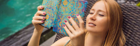 Woman reads e-book on deck chair in the garden BANNER, LONG FORMAT