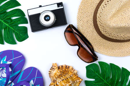 Traveler accessories on white background with empty space for text. Travel vacation concept. Summer background. Road frame set. Flat lay, top view