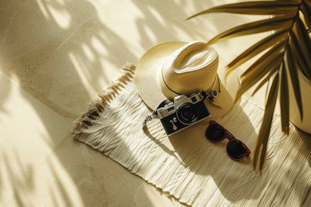 Vintage camera, hat, sunglasses and palm leaf on the floor