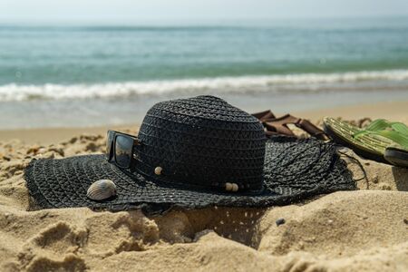 sun hat and sunglasses on a beach blanket. concept of summer holidays