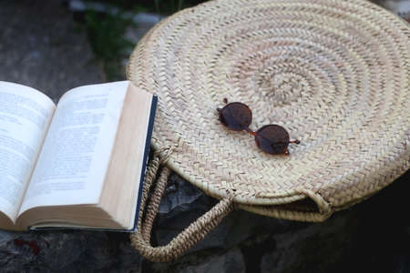 Open book, straw bag and sunglasses in a garden. Selective focus.