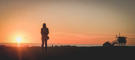 Beautiful Venice beach area in Los Angeles with a pedestrian walk during orange sunset. Empty beach, golden sand, no people.