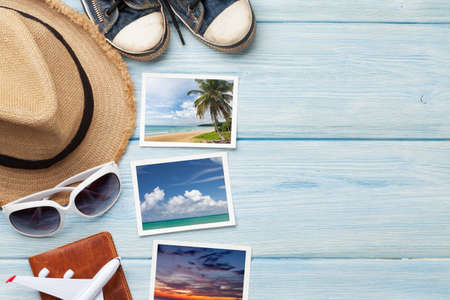 Travel vacation background concept with sunglasses, hat, passport, airplane toy and weekend photos on wooden backdrop. Top view with copy space.