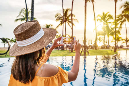 Young woman traveler taking a beautiful sunset at tropical resort beach, Travel lifestyle concept