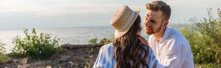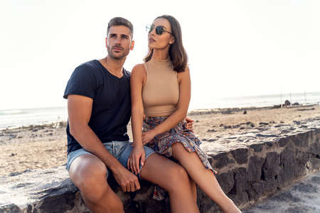 Happy couple in love hugging and relaxing on the coast, on vacation. Fashionbale woman and handsome man.