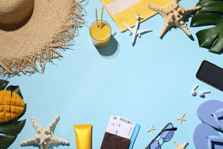 Flat lay composition with passport, tickets and beach accessories on light blue background, space for text. Time to travel