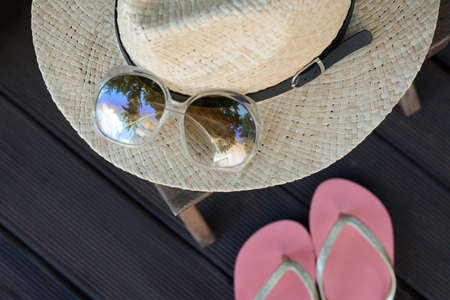 Stylish hat with sunglasses and flip flops on wooden floor, top view. beach accessories
