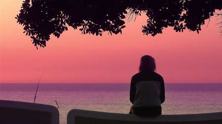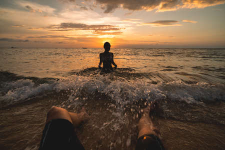 a man and a woman sit on a rock on the shore and look towards the dawn. Sunrise on the Andaman Islands India. silhouette of couple watching sunset on the beach