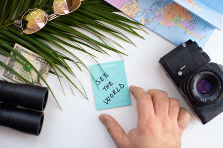 Travel bag, camera, travel map and Panama hat ready for next adventure