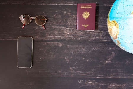 World map and items on wooden background, flat lay. summer travel wanderlust concept, space for text. map camera sunglasses passport phone pen mask book on wooden background top view. vacation planning concept.