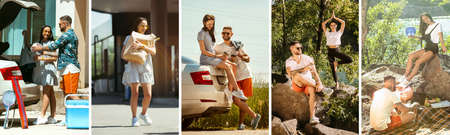 Happy married couple, beautiful girl and young man going to trip, picnic. Composite image, collage