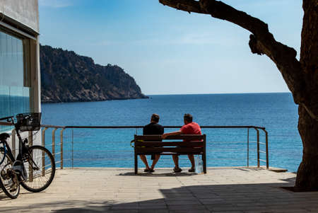 beautiful bench under a big tree with view to the coastline of sant elm, mallorca, spain.