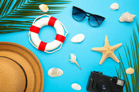 Summer beach holidays concept. Photo camera, hat, summer drink, towel, starfish and seashells on sand beach. Selective focus. Top view.