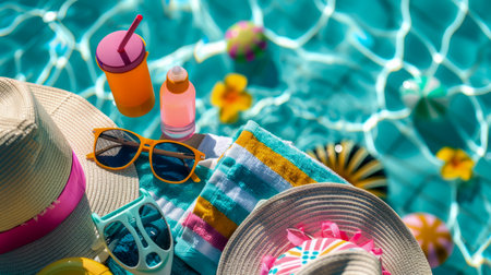 Summer Vibes with Poolside Accessories, Colorful Towel, Sunglasses, and Refreshing Drink on Sunlit Water AI Generative