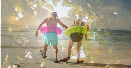 Composition of senior couple walking with inflatables into water on beach and autumn foliage. healthy active retirement lifestyle concept digitally generated image.