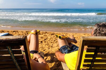 couple of adults on wooden sun beds near the sandy beach enjoy a rest and look at the ocean. Sri Lanka, Asia.