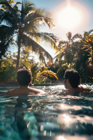 Two men are swimming in a pool with palm trees in the background. Scene is relaxed and carefree