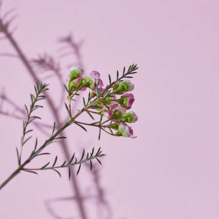 Heather shrub twigs with beautiful flowers on light background, closeup