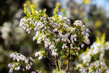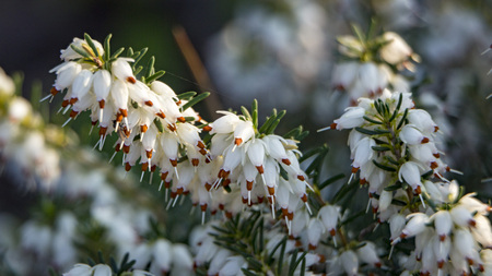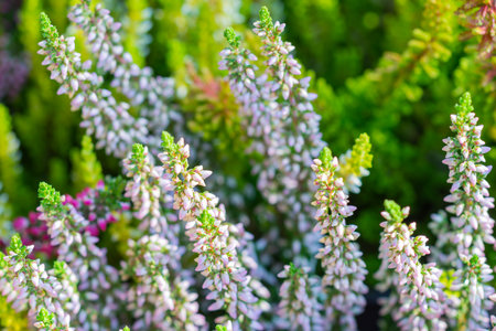 Bright colorful blooming heather Calluna vulgaris with ice crystals. Beautiful soft atmospheric background in pastel light colors. Natural white heather flowers, selective focus