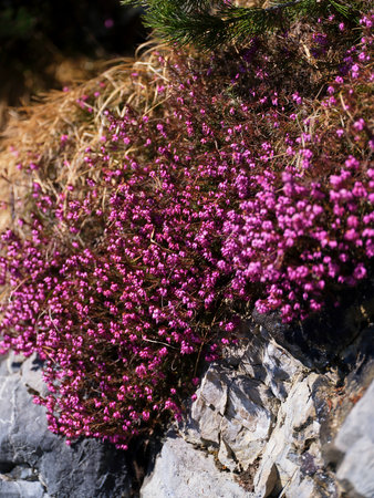 Vibrant heather flowers blooming in shades of pink and white, creating a colorful natural tapestry