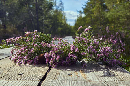 Flowers of heather in purple color from forest arranged on rustic wood background. .