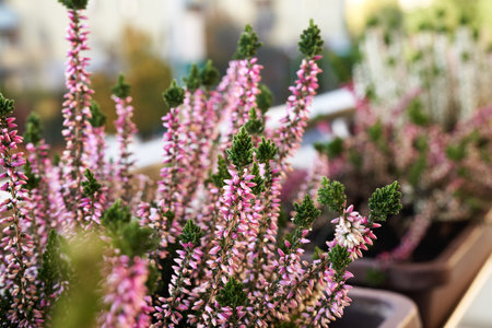 Flowering Heather Plant Closeup, Blurred Erica Flower, Macro Photo of Gardener Heather in Pots at Market, Beautiful Blooming Calluna Flowers with Selective Focus