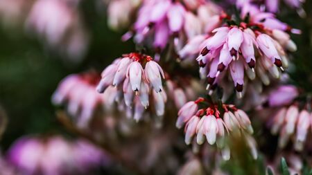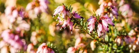 Blooming erica carnea on a blurred background. Pink erica carnea on the field. copy space
