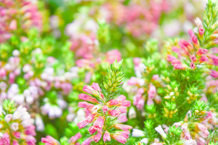 Colorful Erica Flowers Blooming in Garden with Fresh Green Background