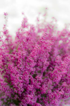 Purple pink common heather (Calluna vulgaris). Landscape plants heather. Colorful traditional October european flower. selective focus