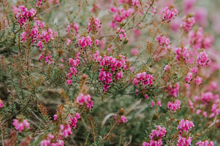 Summer nature. Flowering plant. Flower of pink color in garden. Mountain heather blossom. Pink mountain heather meadow flower. Meadow with wildflower of mountain heather flower in nature