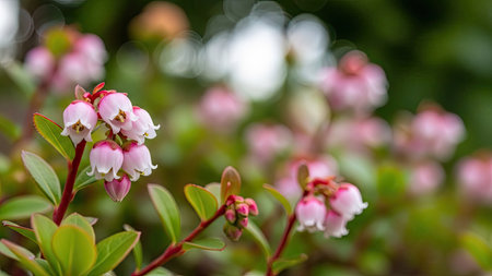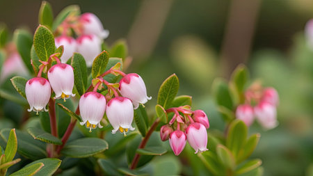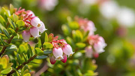 Close up of pink and white flowers of lingonberry (Vaccinium myrtillus)