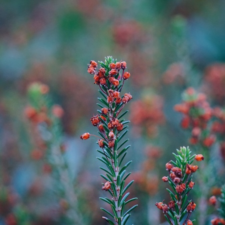 Macro shot of heather (calluna vulgaris) emrging into bloom
