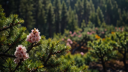 AI Generated. Landscape with pine trees and blooming plum