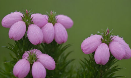 Purple heather flowers with raindrops on a green background.