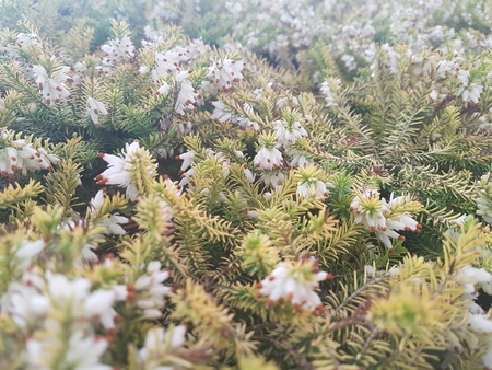 Bright colorful blooming heather Calluna vulgaris with ice crystals. Beautiful soft atmospheric background in pastel light colors. Natural white heather flowers, selective focus