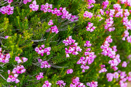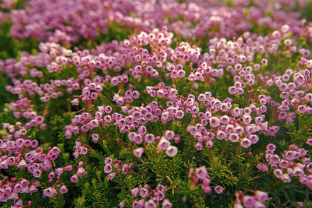 Texture of flowering Heather as a background. Top view. Erica gracilis.